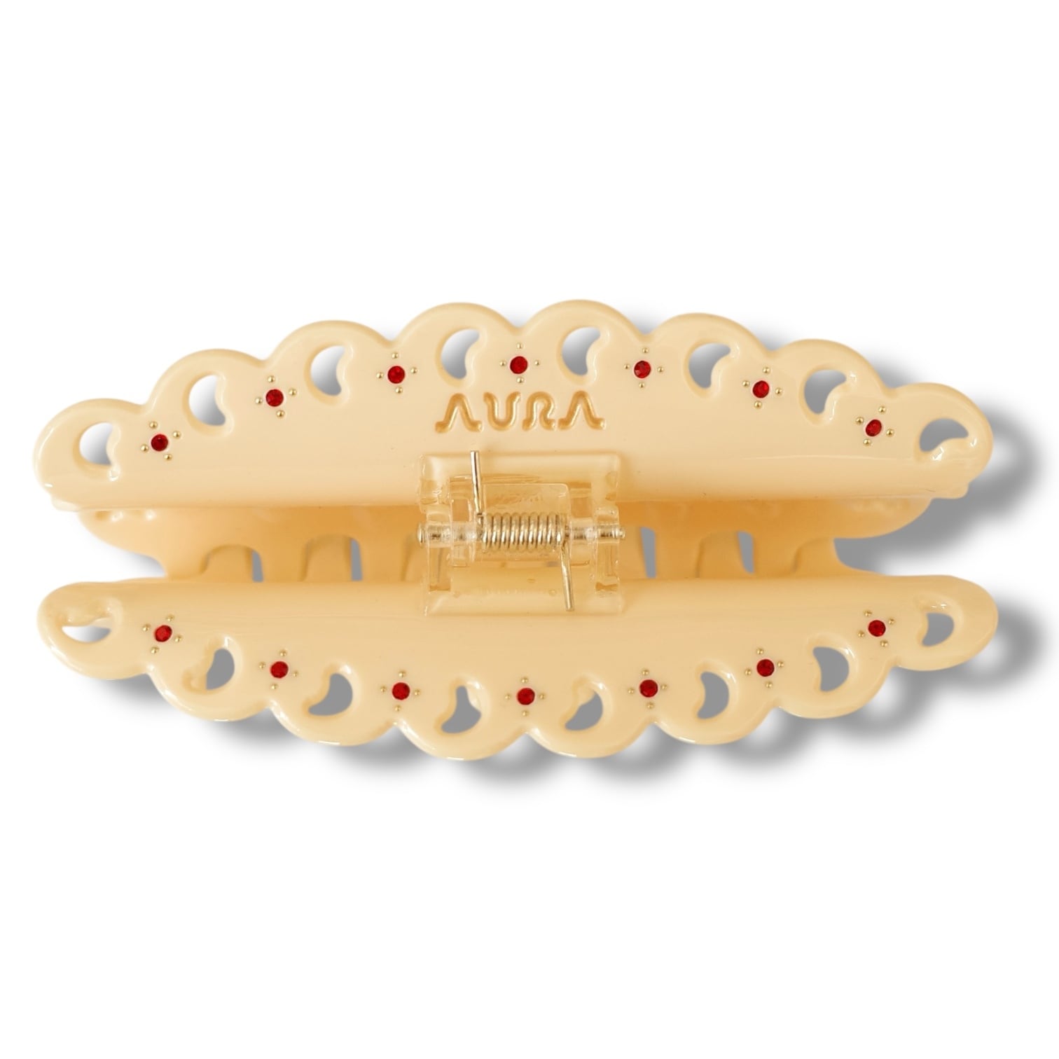 ムーンの間にあしらわれた赤のストーンが、さりげないアクセントとして全体を引き締めます。