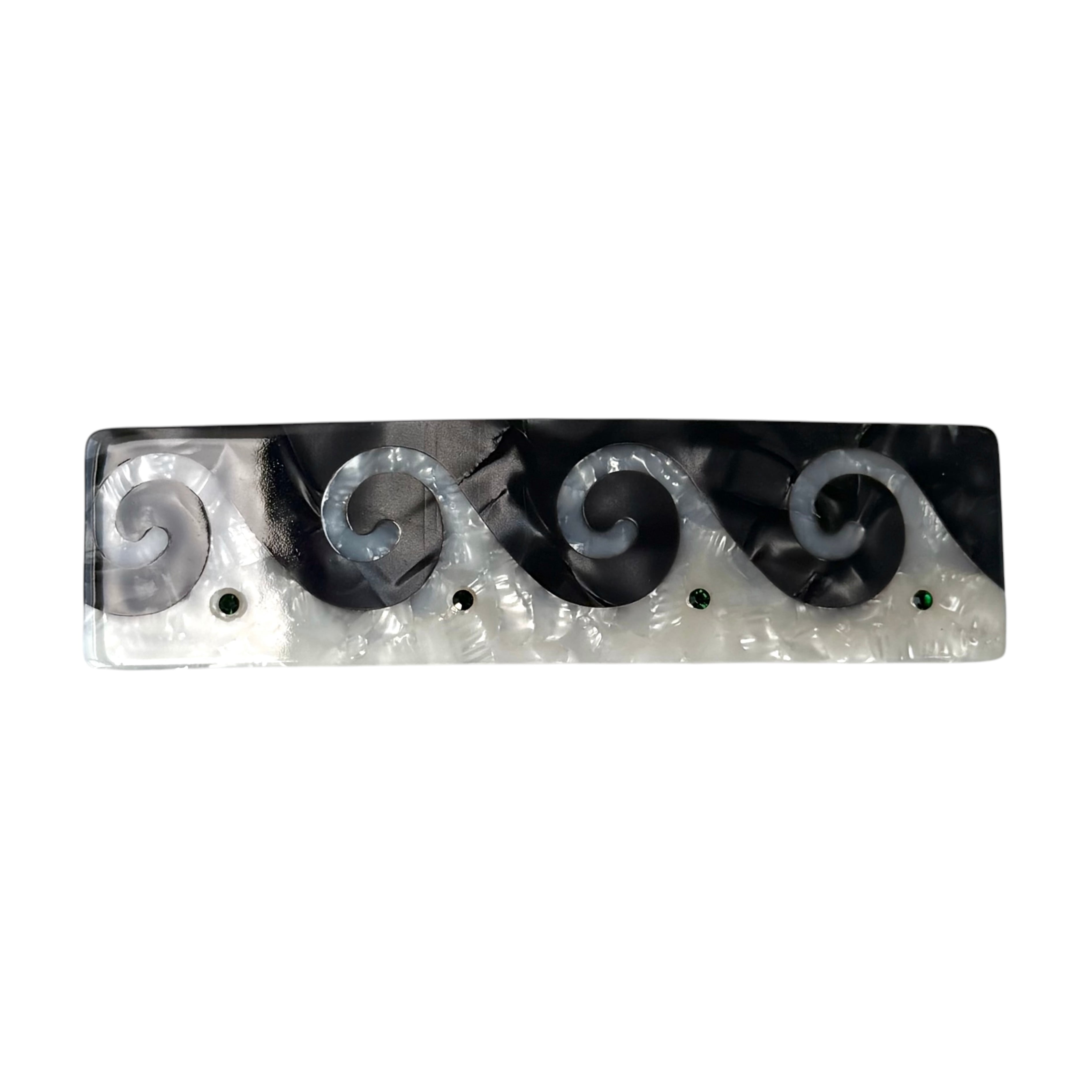 くるんとした波模様に等間隔でラインストーンをあしらったバレッタ〰︎ストーンはグリーン色。